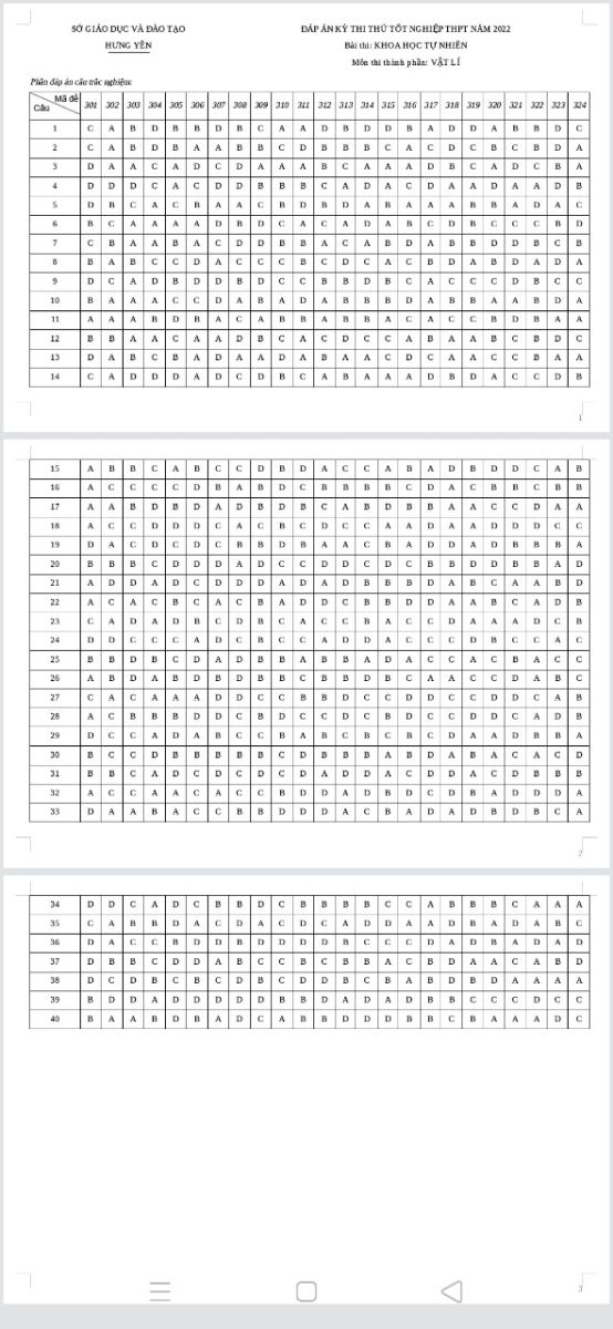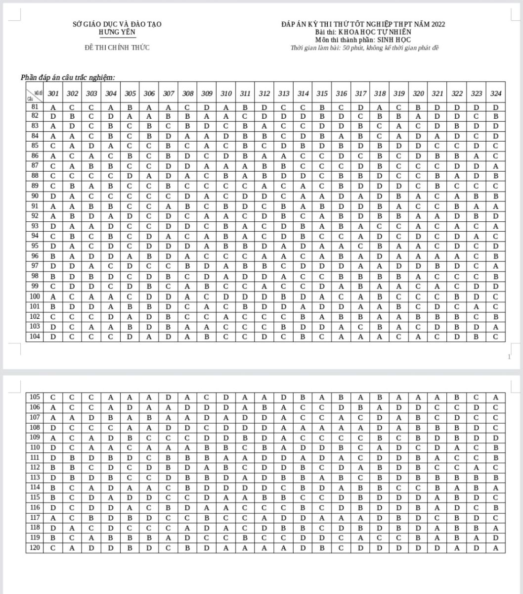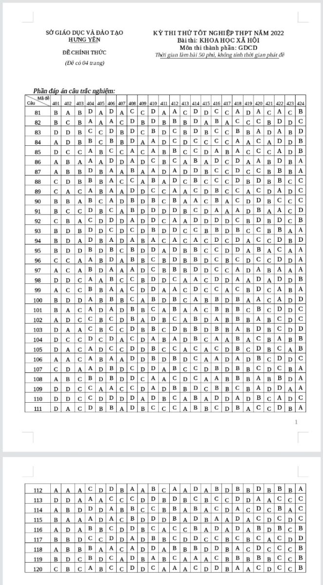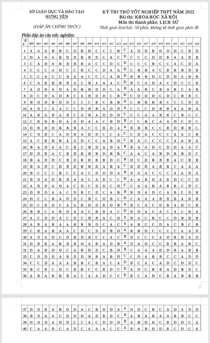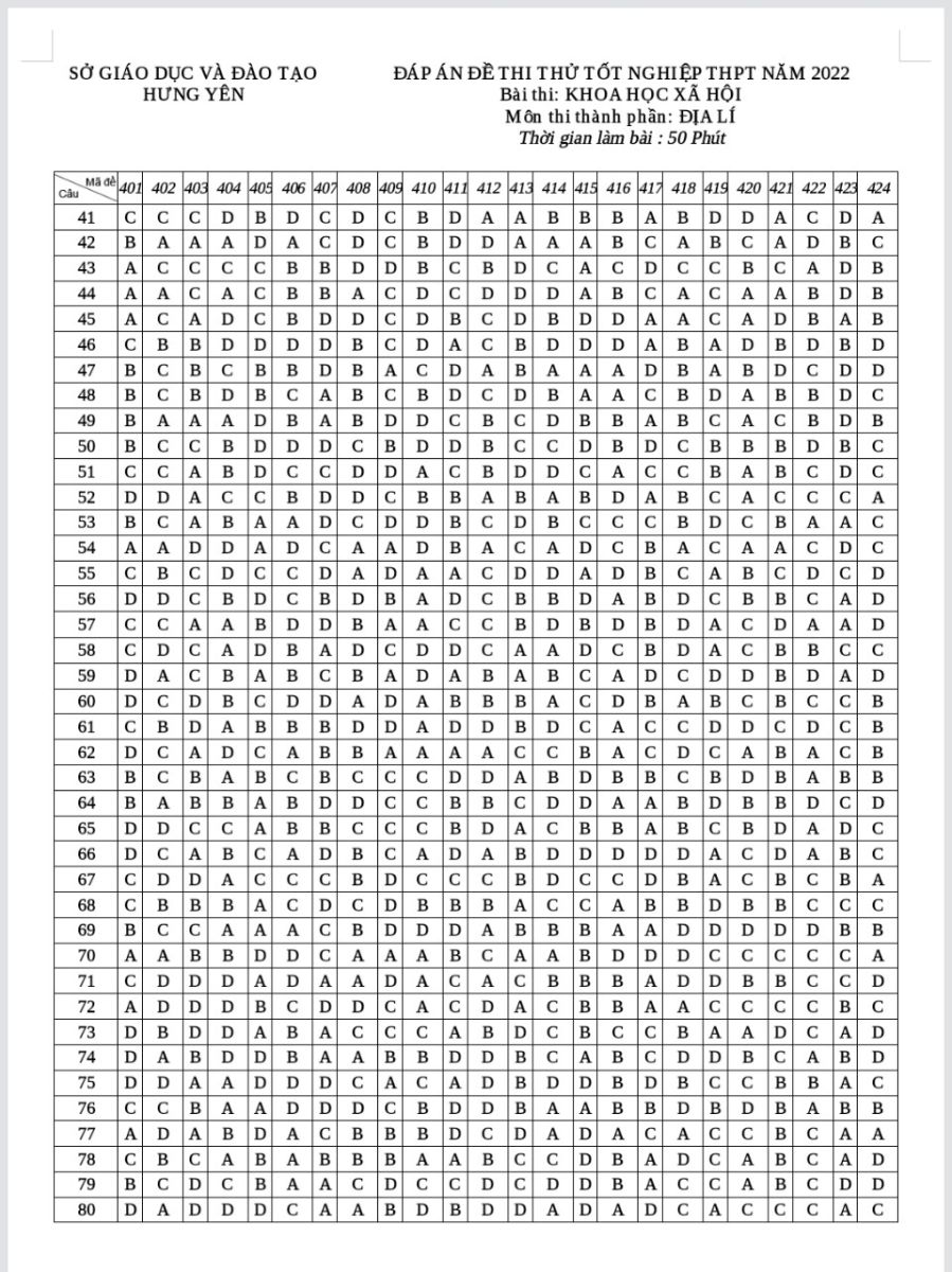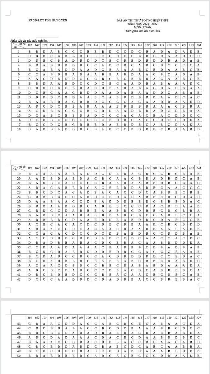 Đáp án đề thi thử của Sở giáo dục và đào tạo Hưng Yên: