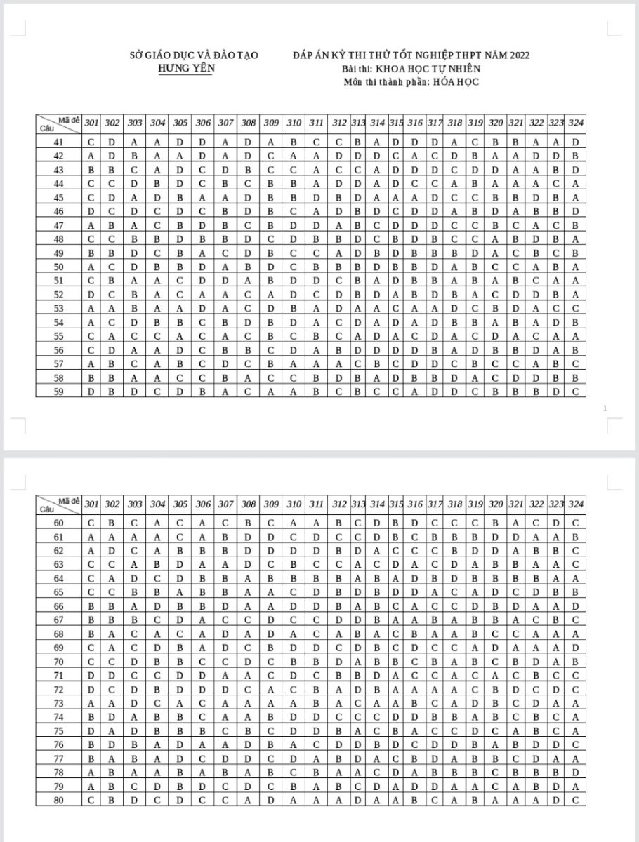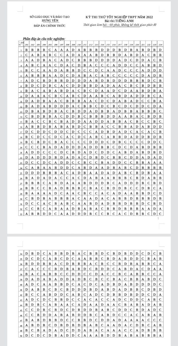 Đáp án các môn kỳ thi thử của Sở năm 2022
