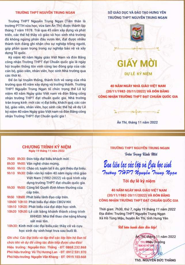 Giấy mời về dự lễ kỉ niệm 40 năm ngày nhà giáo Việt Nam và đón bằng công nhận trường THPT Nguyễn Trung Ngạn đạt chuẩn quốc gia.
