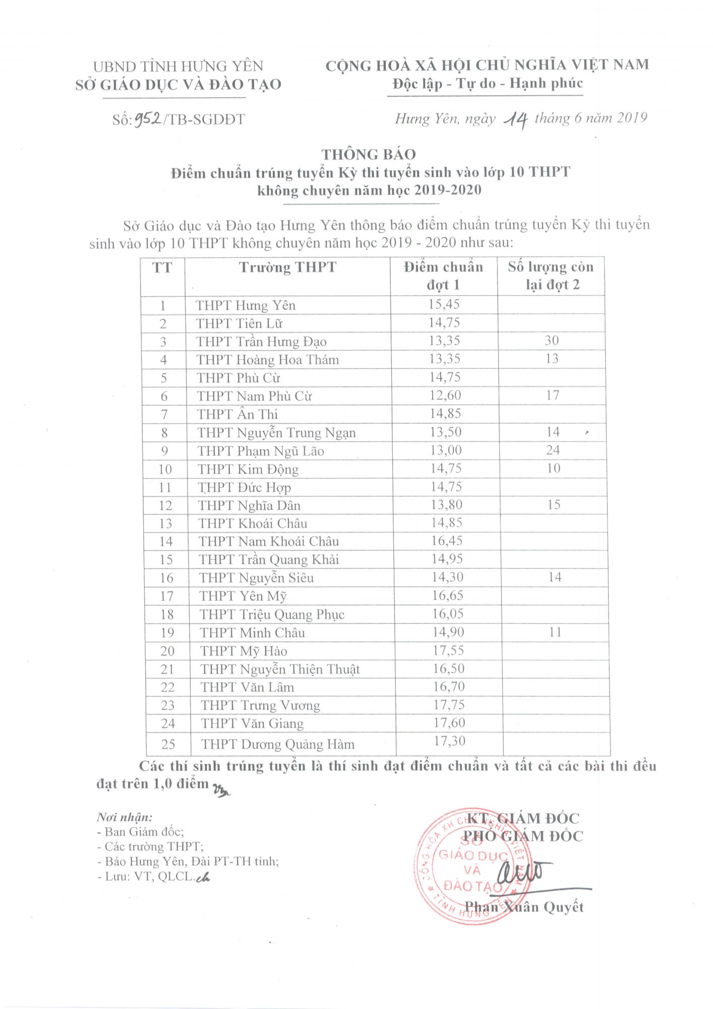 Điểm chuẩn trúng tuyển vào lớp 10 THPT không chuyên tỉnh Hưng Yên năm học 2019-2020