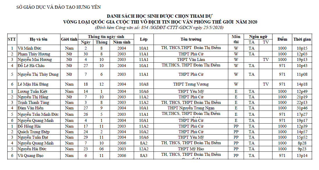 Kết quả Cuộc thi Vô địch Tin học Văn phòng thế giới MOSWC cấp tỉnh năm 2020
