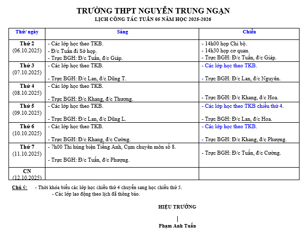 Lịch công tác tuần 5 năm học 2025-2026(04/10/2025)