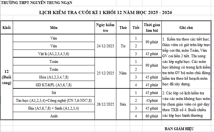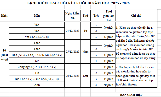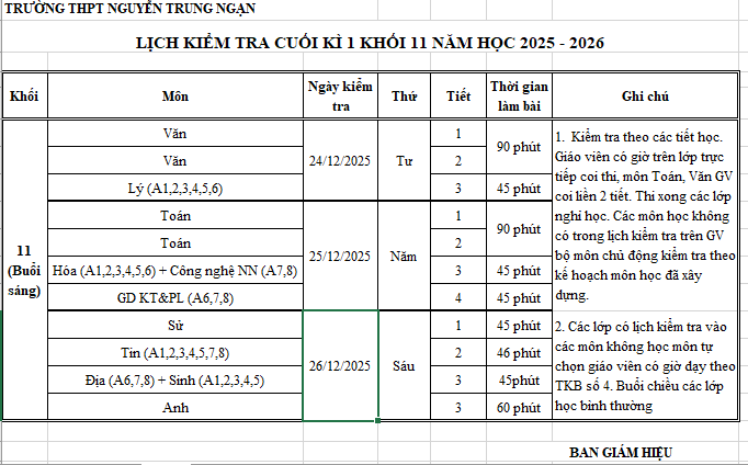 Lịch kiểm tra cuối kì 1 năm học 2025 - 2026(17/12/2025)