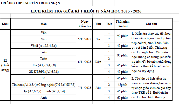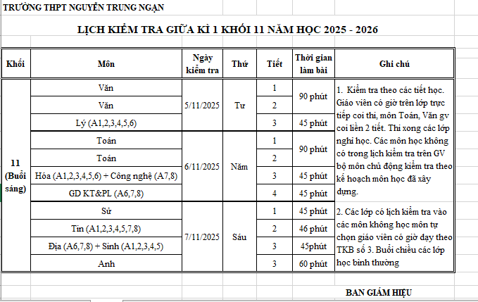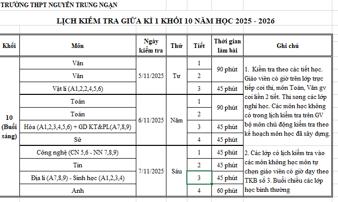 Lịch kiểm tra giữa kì 1 năm học 2025 - 2026(03/11/2025)