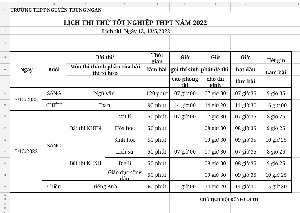Lịch thi thử tốt nghiệp ngày 12,13/5/2022