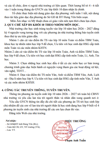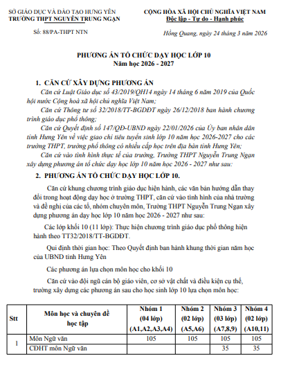 Phương án tổ chức dạy học lớp 10 năm học 2026 - 2027(24/03/2026)